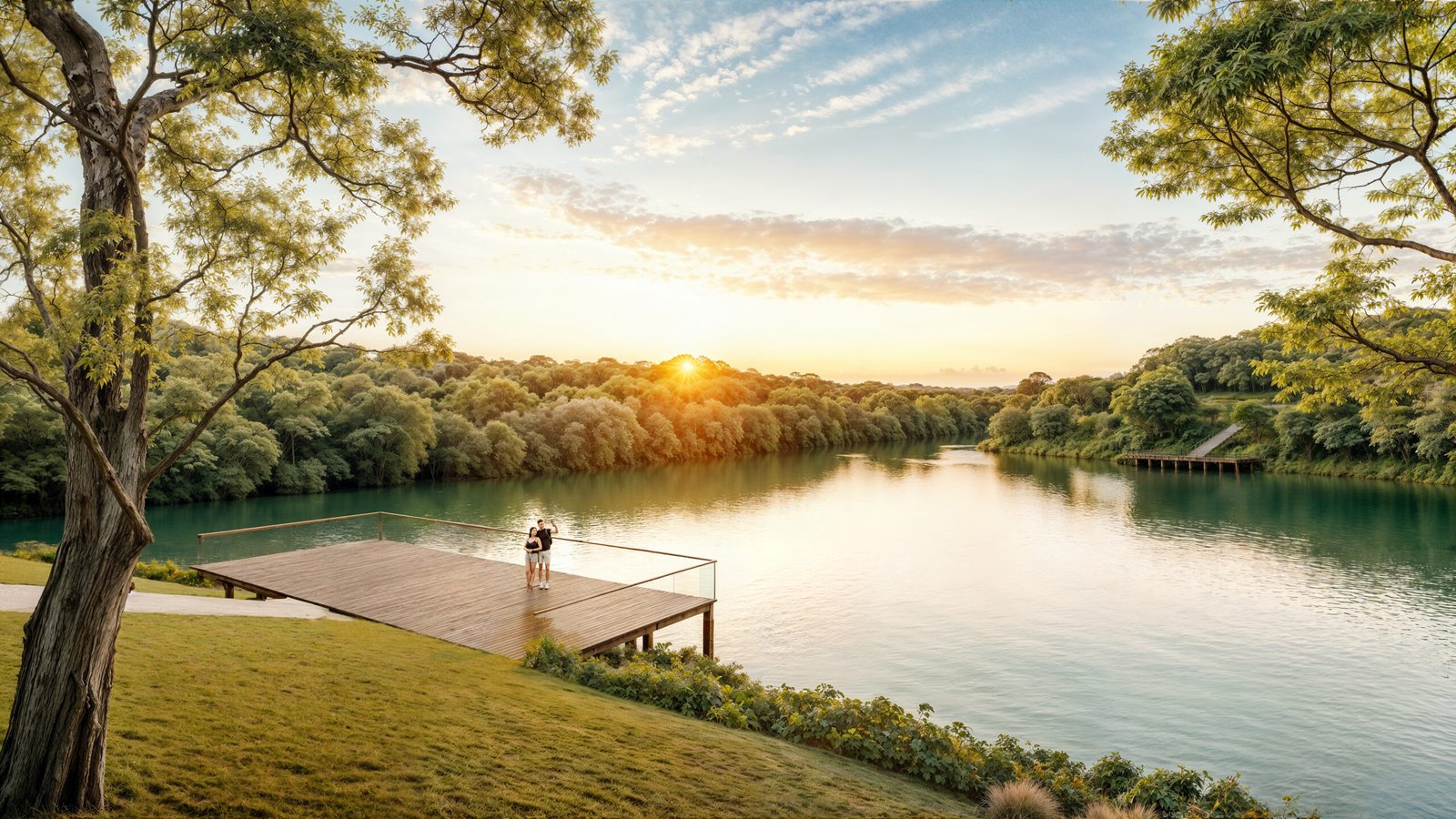Um cenário de contemplação e tranquilidade. O píer sobre o lago cria um ambiente perfeito para apreciar a paisagem e desacelerar.